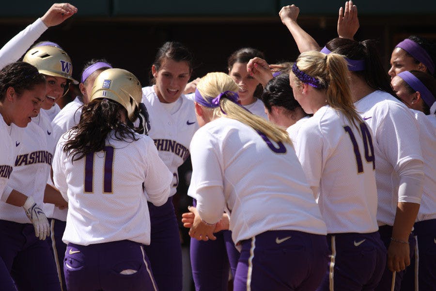 The UW softball team celebrates after Ashley Charters hit the game-winning home run during its 3-2 win over Arizona State April 5.