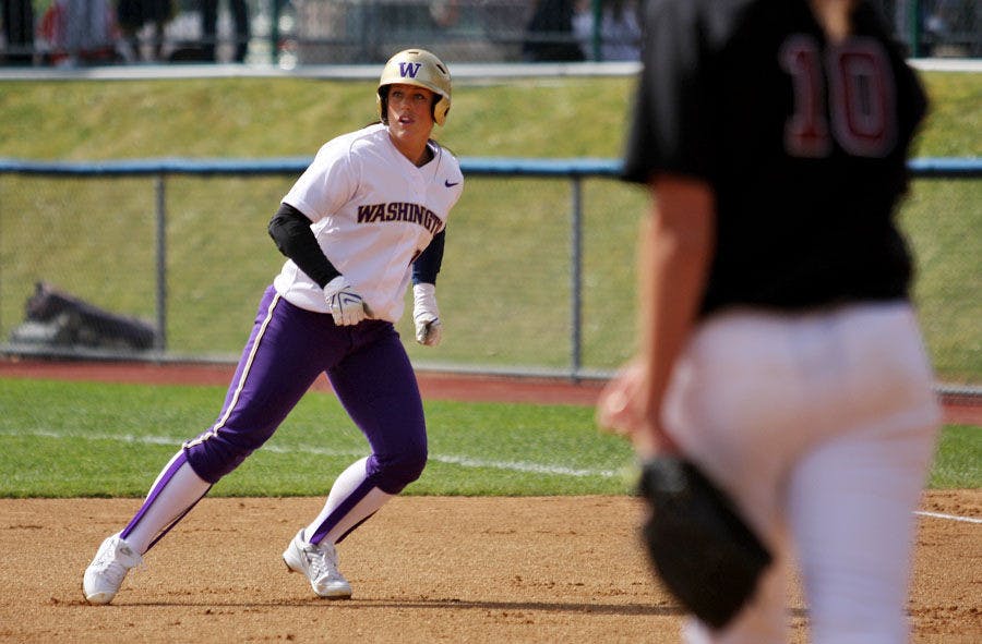 Danielle Lawrie rounds first base after hitting an RBI single in Washington's 3-2 win over ASU April 5.