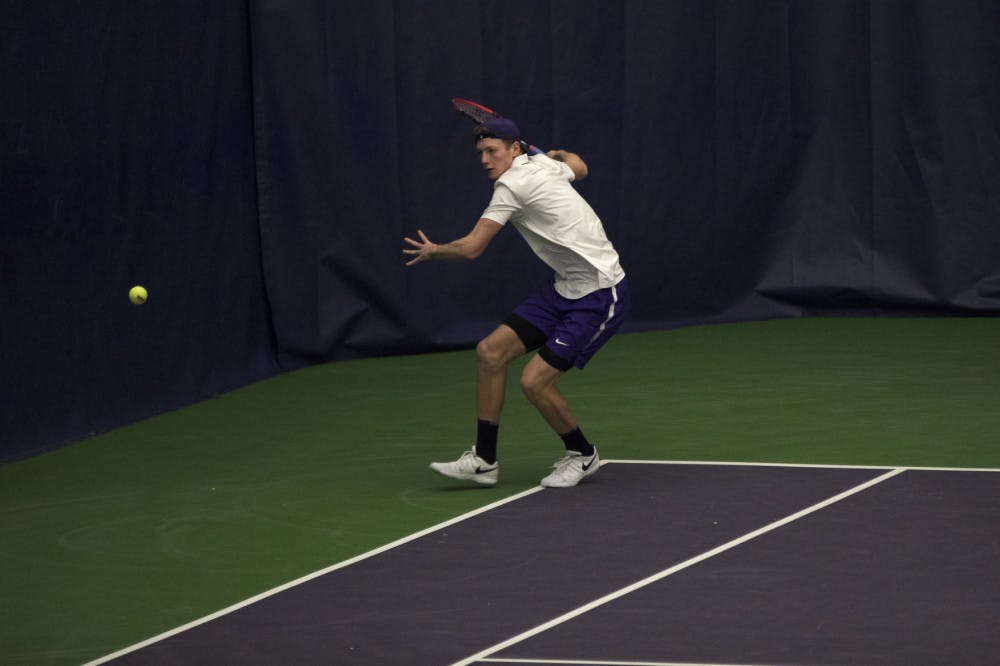 Freshman Jack Davis returns a cross court shot in UW's win over Pepperdine.