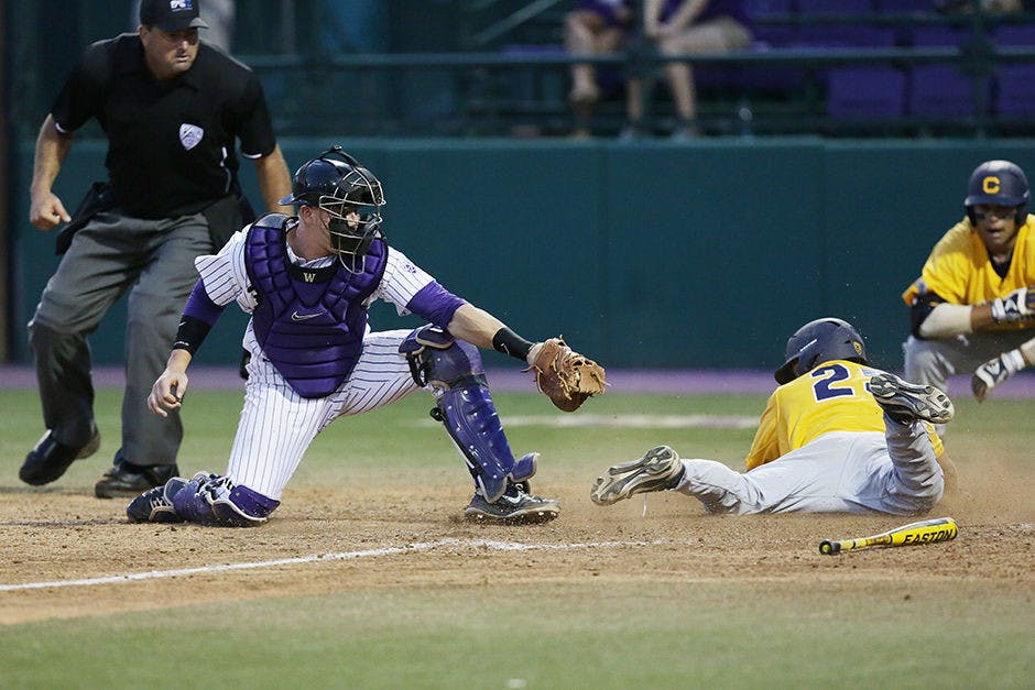 Cal’s Brian Celsi scores the go-ahead run in the top of the 12th inning on Friday. The Huskies came back to win that game, but lost the series after another extra-innings marathon on Sunday.