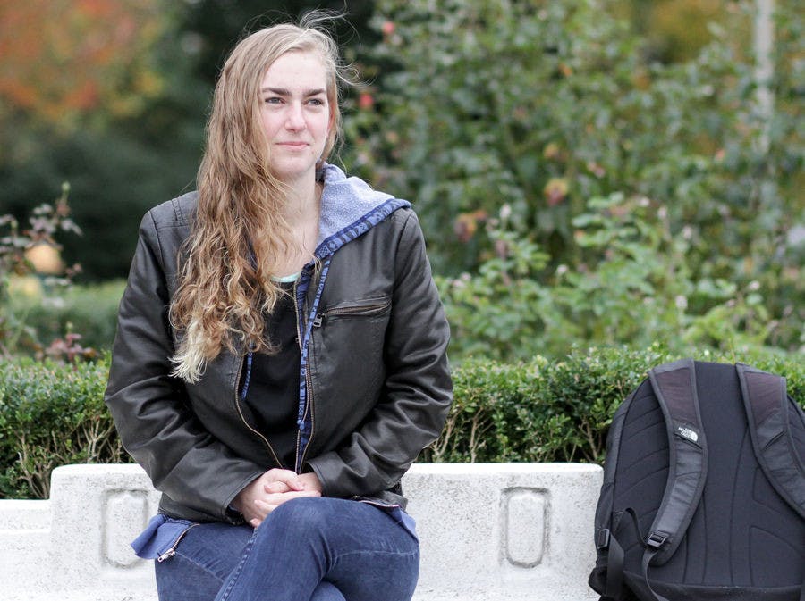 Junior Kaija Reinelt sits on a bench near Drumheller fountain. It was at this bench that Reinelt came to the realization that everyone carries their own pain.