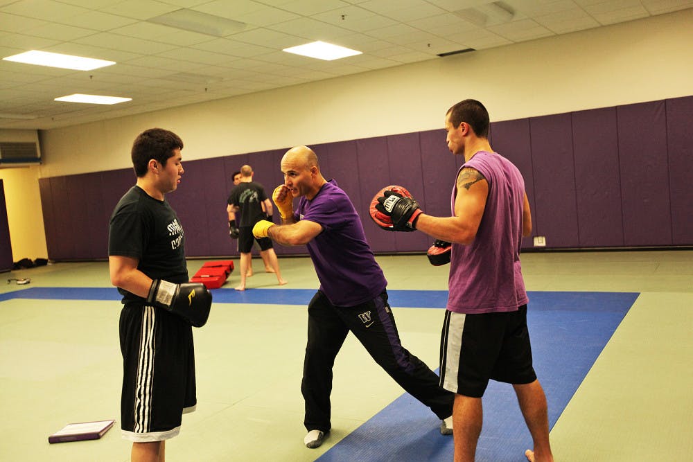 Volunteer coach Chris Mendez demonstrates the steps that go into a 3 hit combo.