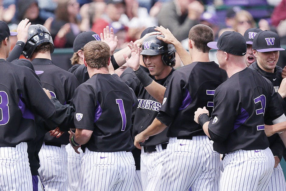 Michael Camporeale is congratulated in the seventh inning Sunday after he scored on a Robert Pehl single to give the Huskies a three-run lead.