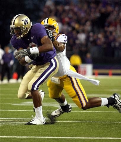 James Johnson shakes a tackle and scores a touchdown in the first quarter of Washington's game against LSU on Saturday.