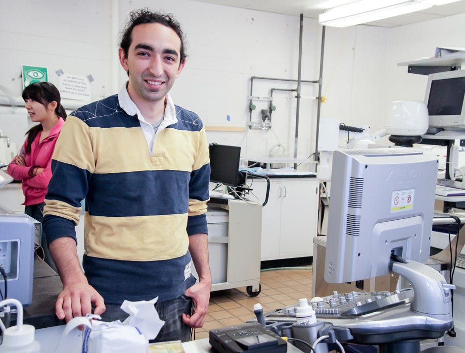 Navid Farr, bioengineering researcher, stands near an ultrasound machine in the Old Fisheries Building lab. The ultrasound machine is used to target and break apart tumors or help to release drug capsules in the body to ensure accurate drug delivery.