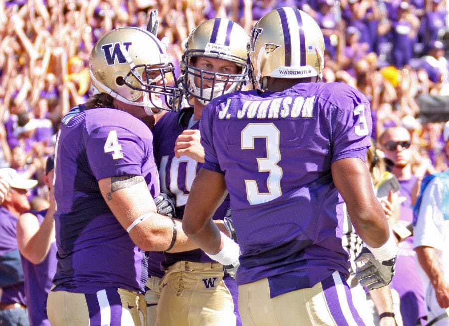 Jake Locker (middle) is congratulated by Chris Izbicki (left) and James Johnson (right) after running for a touchdown in the first quarter of Washington's 42-23 win over Idaho on Sept. 12 at Husky Stadium.
