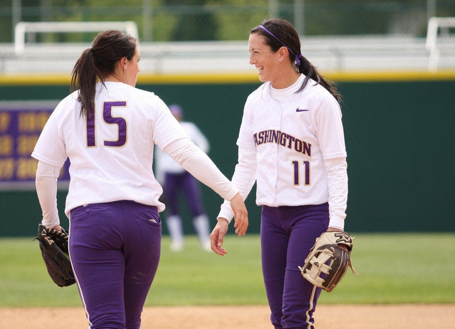 Danielle Lawrie, left, and Ashley Charters share a laugh during the Huskies' 7-0 win against Stanford May 7.