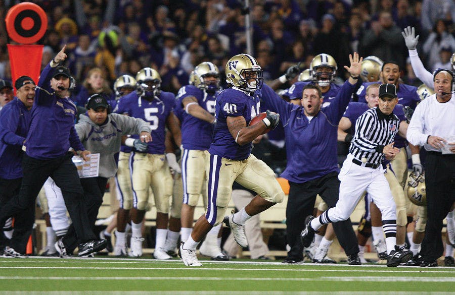 Junior Mason Foster sprints down the Washington sideline after intercepting a pass that deflected off of the foot of Arizona's Delashaun Dean. Foster's interception lifted UW past Arizona, 36-33, Saturday night at Husky Stadium.