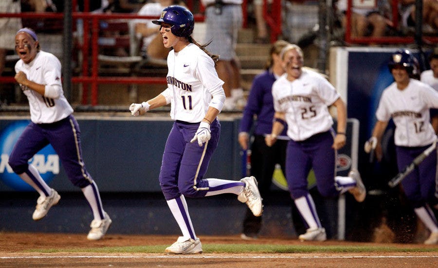 Ashley Charters runs home after a grand slam by Danielle Lawrie in the first inning of yesterday's Women's College World Series softball game between Washington and Georgia at the ASA Hall of Fame Stadium in Oklahoma City.
