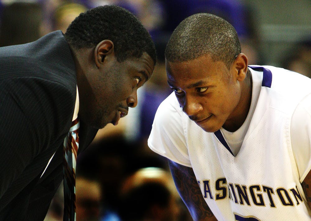 Former assistant coach Cameron Dollar talks to sophomore Isaiah Thomas during a free throw last season. Dollar faces his former boss, Washington's head coach Lorenzo Romar, as the head coach of the Seattle University Redhawks tonight.