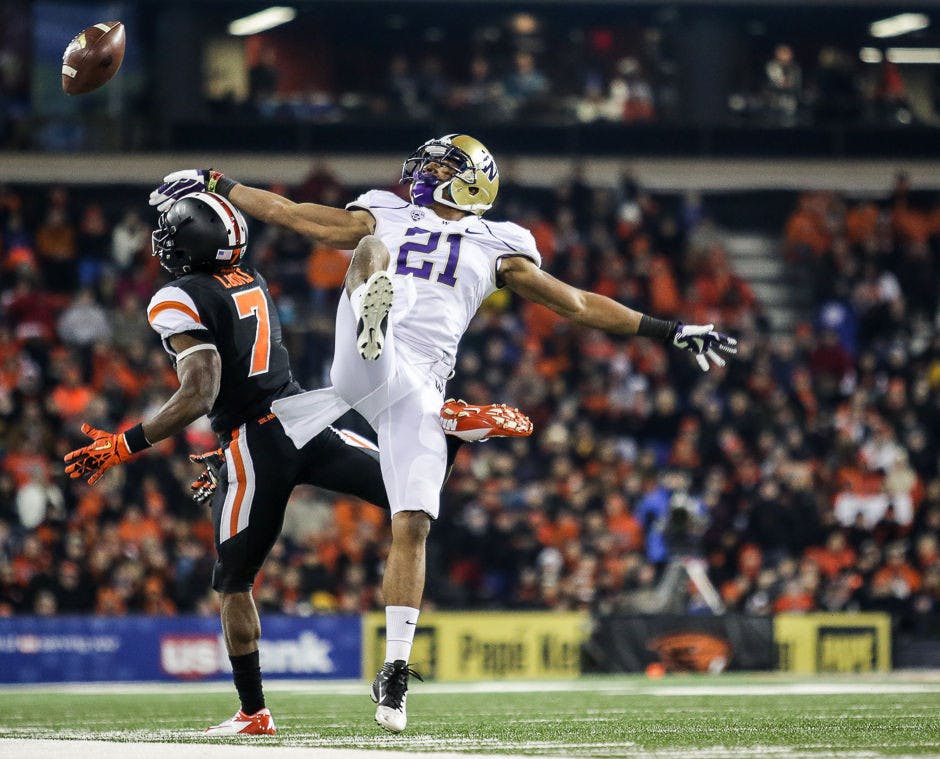 Cornerback Marcus Peters breaks up a pass in the second quarter of Washington's 69-27 win over Oregon State.