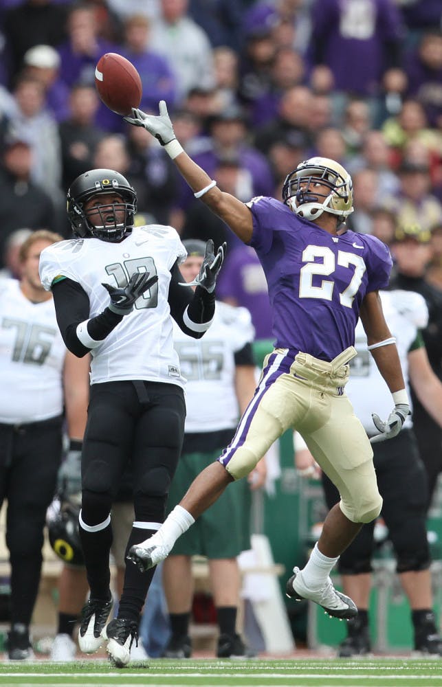 Redshirt freshman Adam Long barely gets a finger on a pass intended for Oregon's Jamere Holland in the Huskies' 43-19 loss to Oregon on Saturday.