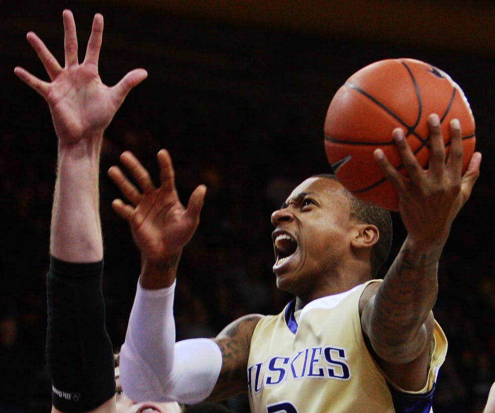Sophomore guard Isaiah Thomas goes up for two in Washington's 63-59 win against Montana Sunday. Thomas led Washington with 13 points.