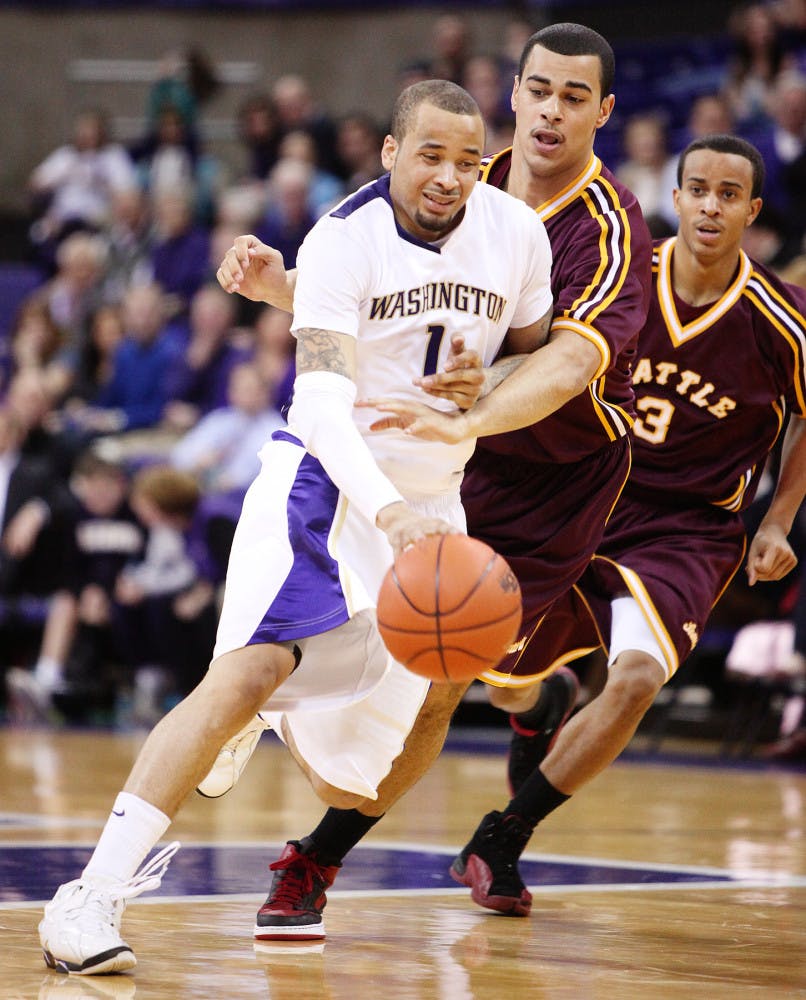 Junior guard Venoy Overton drives past a Seattle University defender in Washington's 123-76 win over SU last week.
