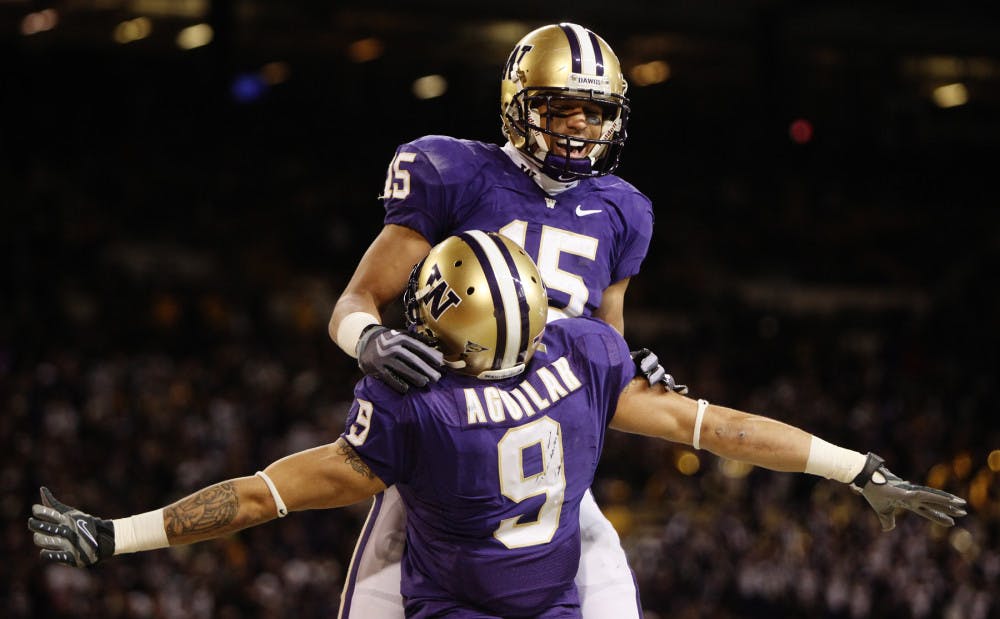 Jermaine Kearse jumps on wide receiver Devin Aguilar after a touchdown reception by Aguilar in Washington's 42-10 win against Cal Saturday. Aguilar had two touchdown catches during the game.