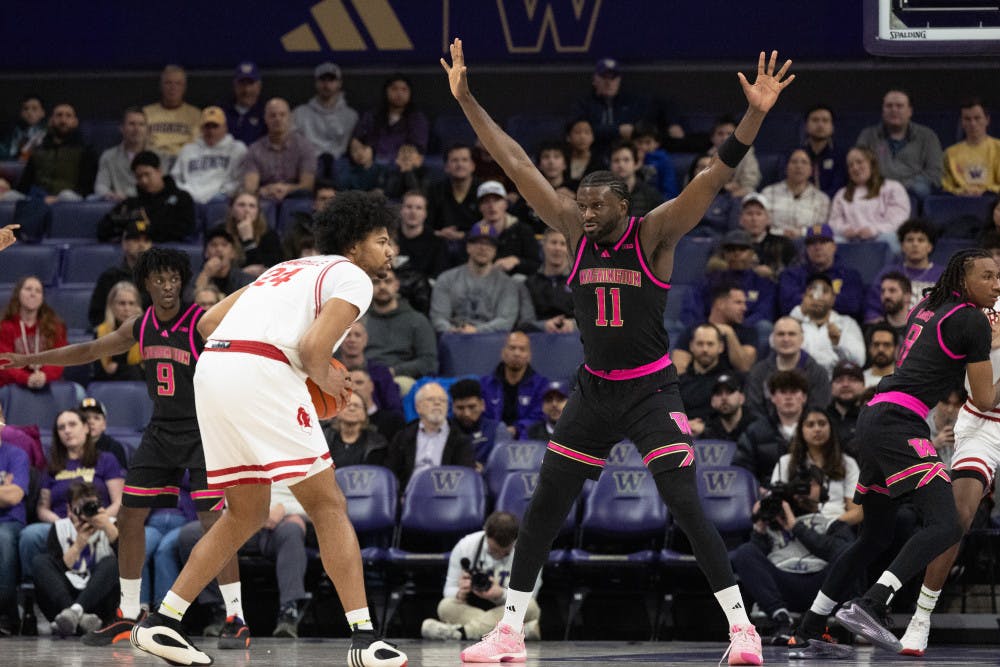 Graduate student center Franck Kepnang raises his hands in defense during Washington men's basketball against Rutgers at Alaska Airlines Arena in Seattle, Washington on February 19, 2025.
