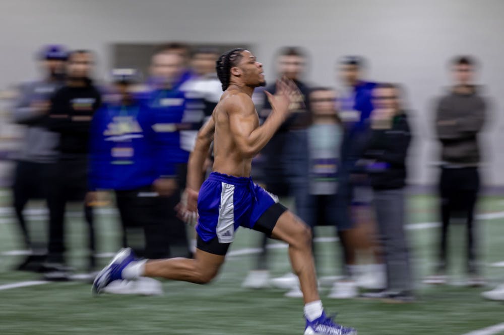 Senior safety Cameron Broussard sprints the 40-yard dash during Washington's Pro Day at Dempsey Indoor Center in Seattle, Washington on March 10, 2025.