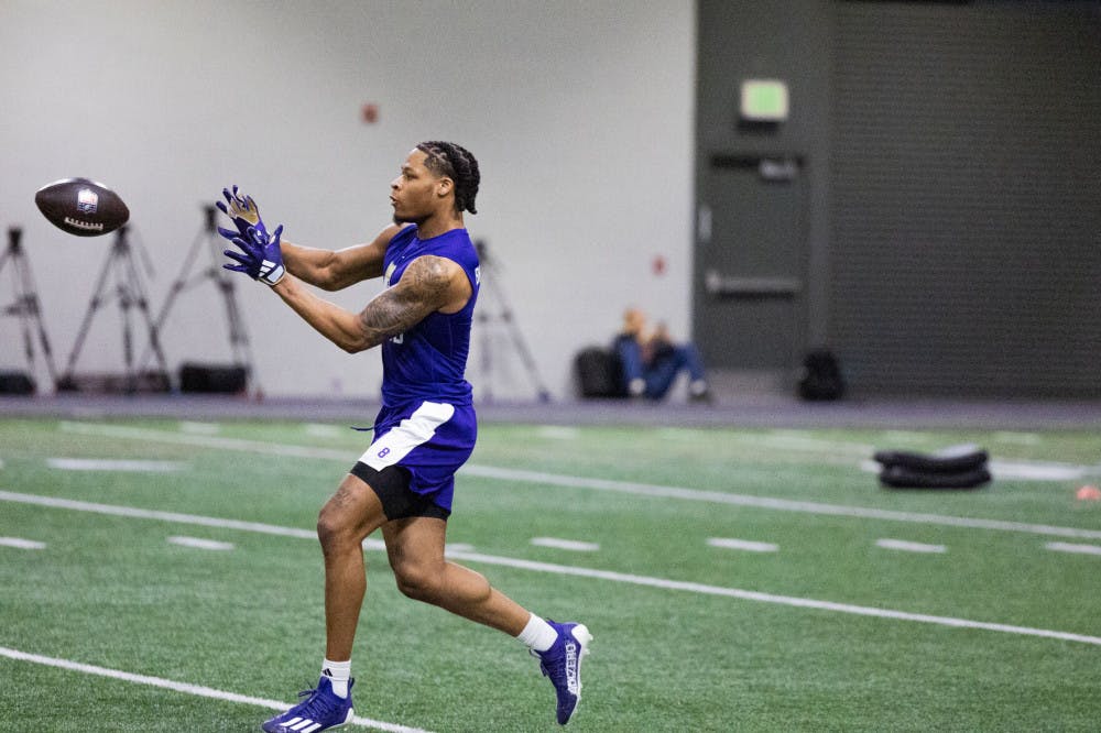 Senior safety Cameron Broussard cacthes the football during a specialized drill during Washington's Pro Day at Dempsey Indoor Center in Seattle, Washington on March 10, 2025.