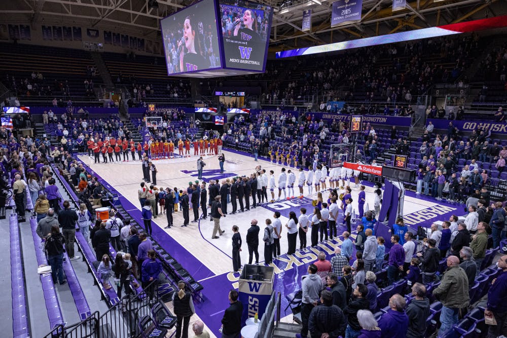 Washington lined up during the National Anthem before the teams faces off against USC in Alaska Airlines Arena on December 7th, 2024.