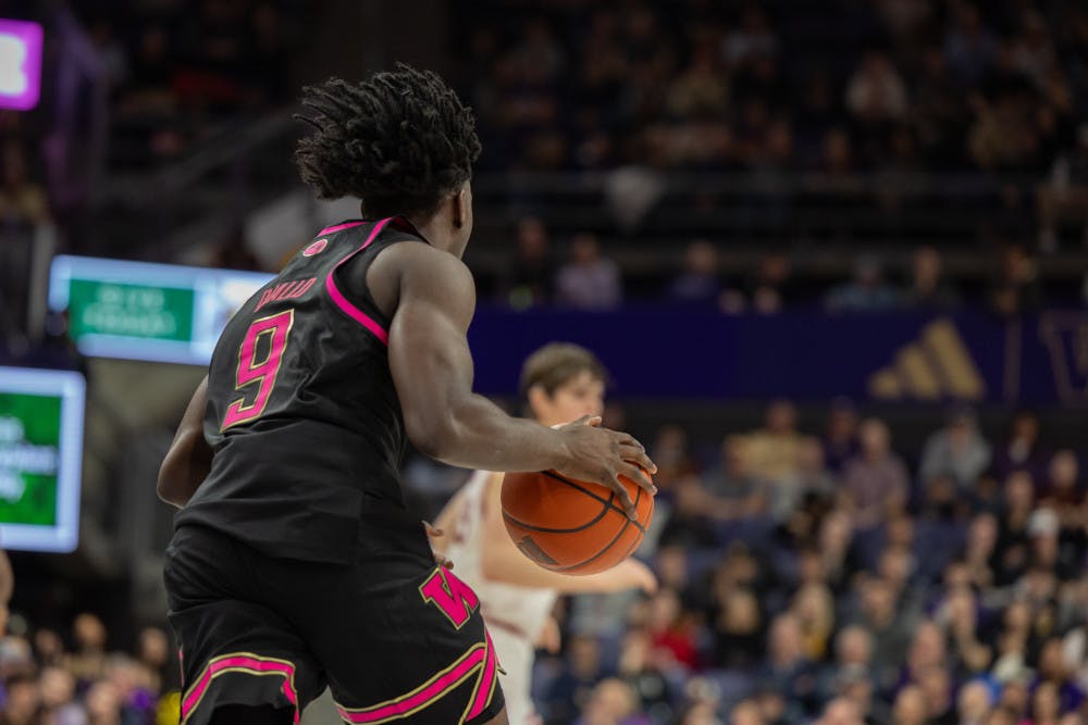 Freshman guard Vazoumana Diallo dribbles the downcourt during Washington men's basketball against Rutgers at Alaska Airlines Arena in Seattle, Washington on February 19, 2025.