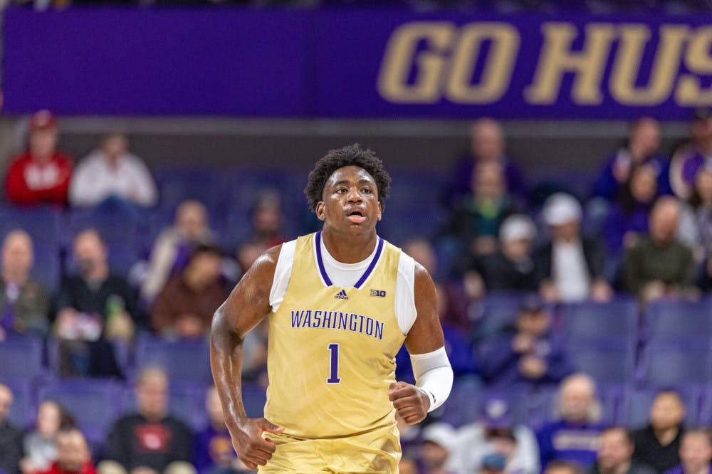 Washington forward Great Osobor runs down the court against Nebraska on February 5th, 2025 inside of Alaska Airlines Arena.