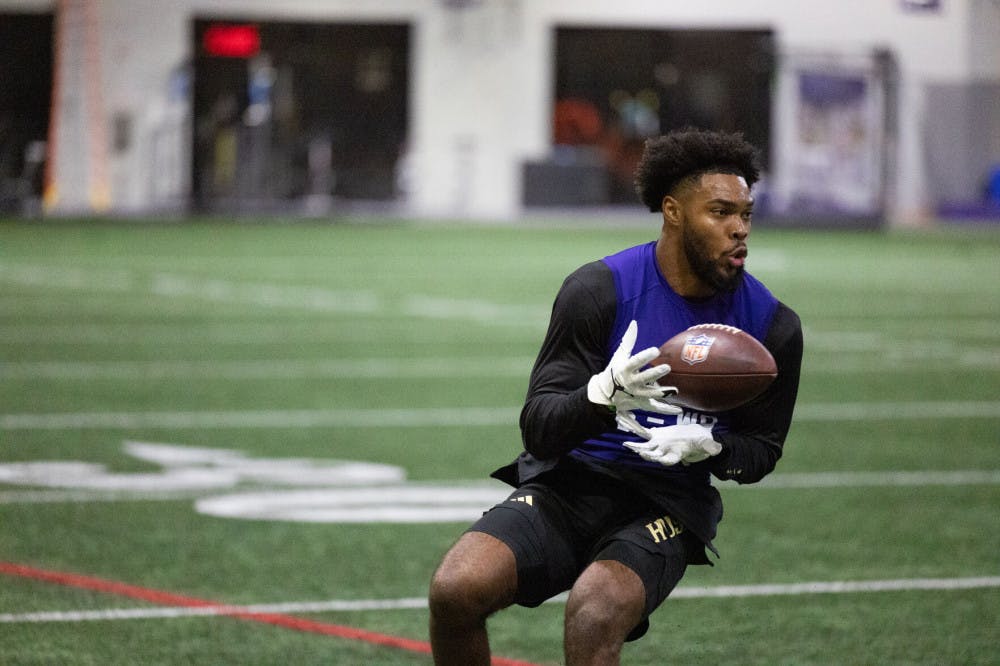 Senior wide receiver Jeremiah Hunter completes a quick pass from quarterback Will Rogers during Washington's Pro Day at Dempsey Indoor Center in Seattle, Washington on March 10, 2025.