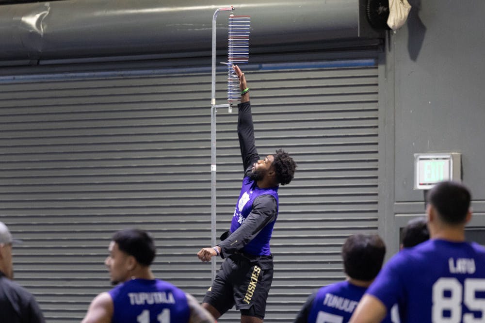 Senior wide receiver Jeremiah Hunter completes his vertical jump test during Washington's Pro Day at Dempsey Indoor Center in Seattle, Washington on March 10, 2025.