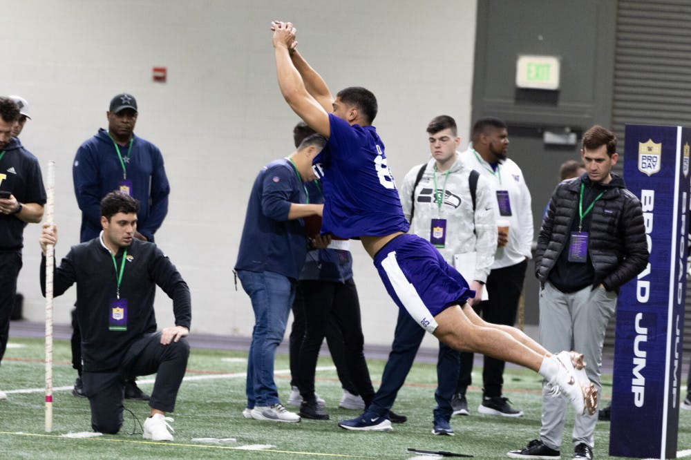 Senior tight end Keleki Latu completes his broad jump test during Washington's Pro Day at Dempsey Indoor Center in Seattle, Washington on March 10, 2025.