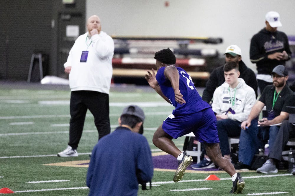 Senior running back Daniyel Ngata completes the pro shuttle during Washington's Pro Day at Dempsey Indoor Center in Seattle, Washington on March 10, 2025.