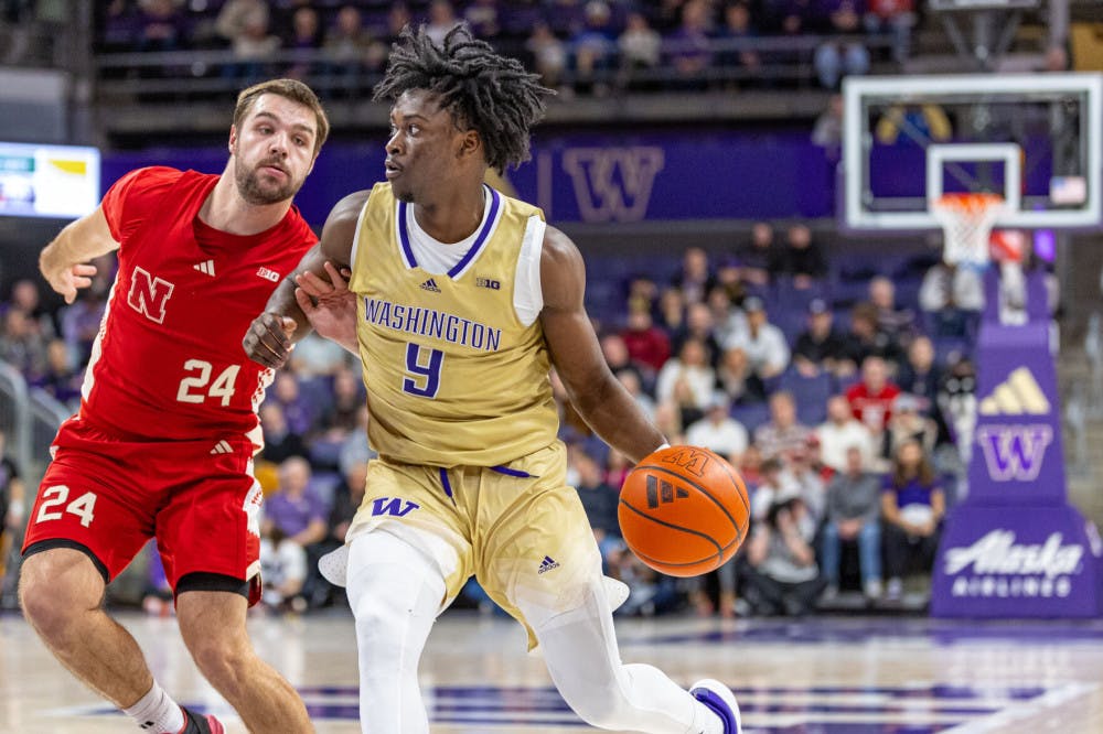 Washington guard Vazoumana Diallo drives the basketball against Nebraska on February 5th, 2025 inside of Alaska Airlines Arena.