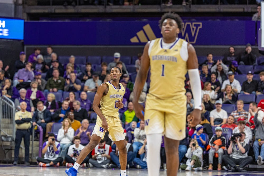 Washington guard Mekhi Mason watches gameplay against Nebraska on February 5th, 2025 inside of Alaska Airlines Arena.