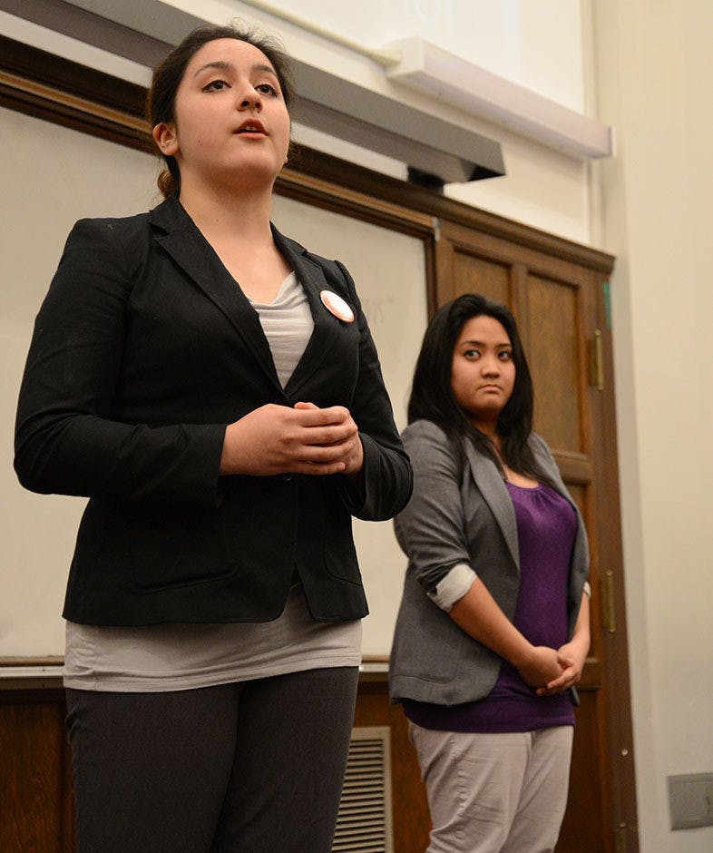 Monica Mendoza and Kristine Maramot, both Director of Diversity Efforts candidates, answer questions at the forum put on by the College Republicans and the Young Democrats. Mendoza recently resigned as Director of Diversity Efforts.