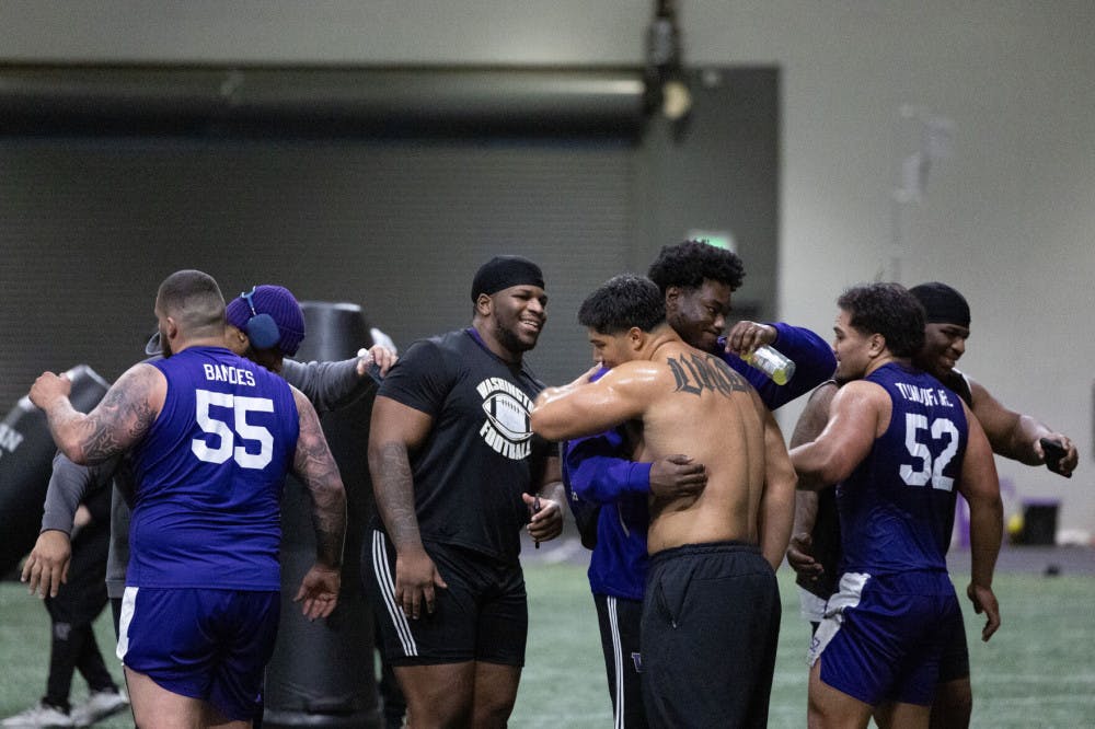 Washington Football congratulates the linemen on completing their portion of Pro Day at Dempsey Indoor Center in Seattle, Washington on March 10, 2025.