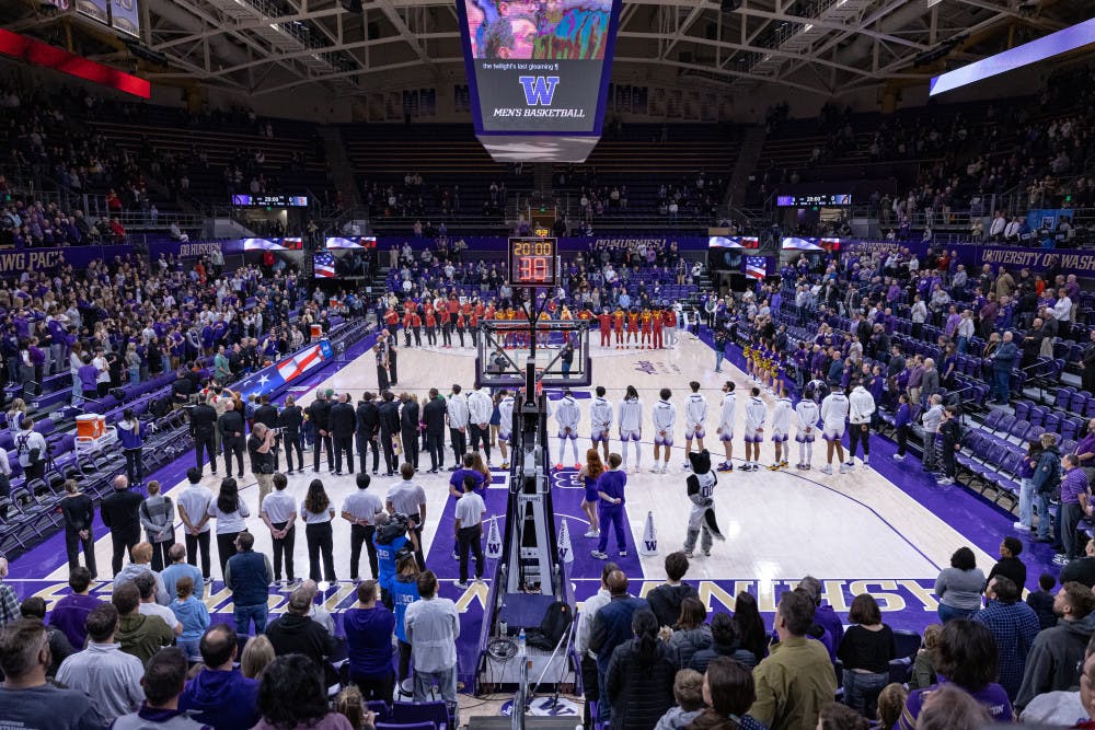 Washington lined up during the National Anthem before the teams faces off against USC in Alaska Airlines Arena on December 7th, 2024.