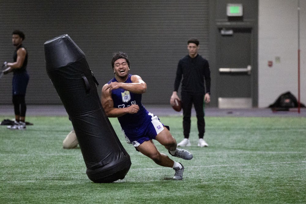 Senior defensive lineman Voi Tunuufi manuevers his way around a tackling dummy during Washington's Pro Day at Dempsey Indoor Center in Seattle, Washington on March 10, 2025.