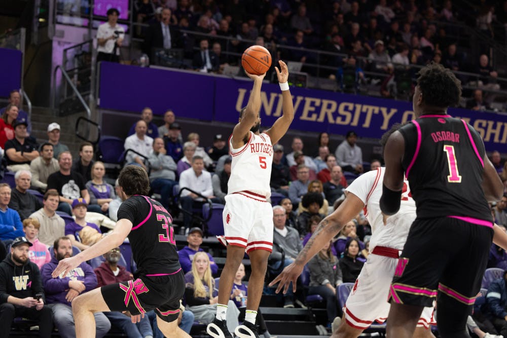 Rutgers guard Tyson Acuff shoots and open three-pointer during Washington men's basketball against Rutgers at Alaska Airlines Arena in Seattle, Washington on February 19, 2025.