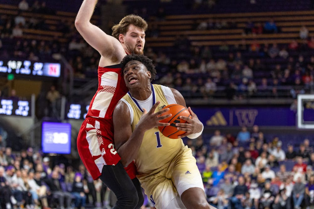 Washington forward Great Osobor drives the basketball toward the hoop against Nebraska on February 5th, 2025 inside of Alaska Airlines Arena.