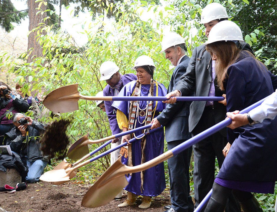 University officials and members of the tribal leadership and planning committee ceremonially break ground for the new Intellectual House that will take the place of the N6 parking lot. The longhouse is set to open in October 2014.