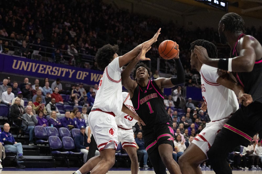 Senior forward Great Osobor fights for a lay-up during Washington men's basketball against Rutgers at Alaska Airlines Arena in Seattle, Washington on February 19, 2025.