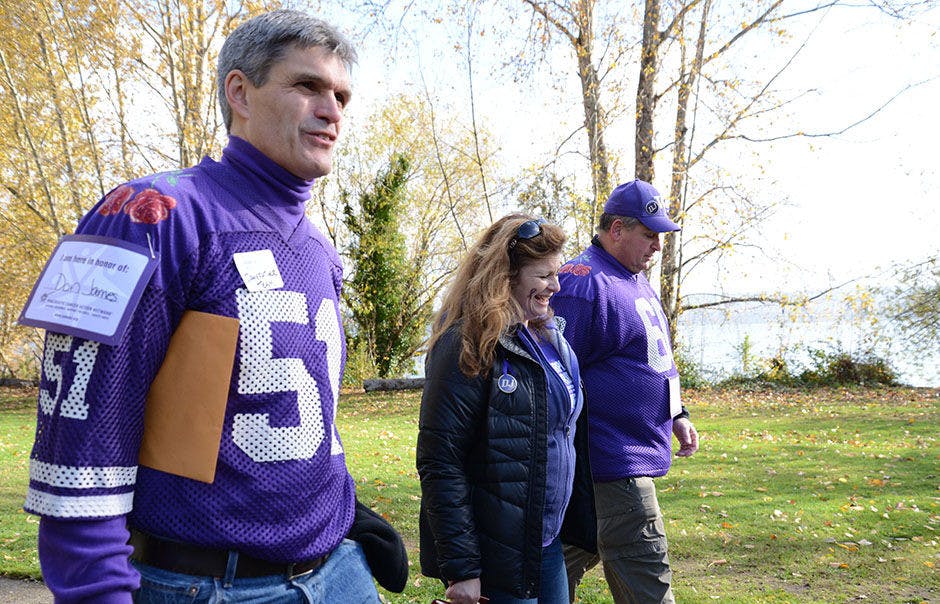 Dan Eernissee (front), former center, organized "The Dawgfather Team" for the PurpleStride Puget Sound 2013 5K Walk to honor former UW football coach Don James.