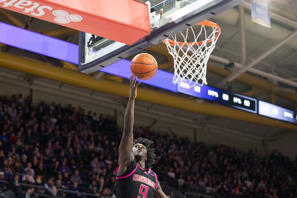 Freshman guard Vazoumana Diallo sinks in a lay-up during Washington men's baskteball against Rutgers at Alaska Airlines Arena in Seattle, Washington on February 19, 2025.