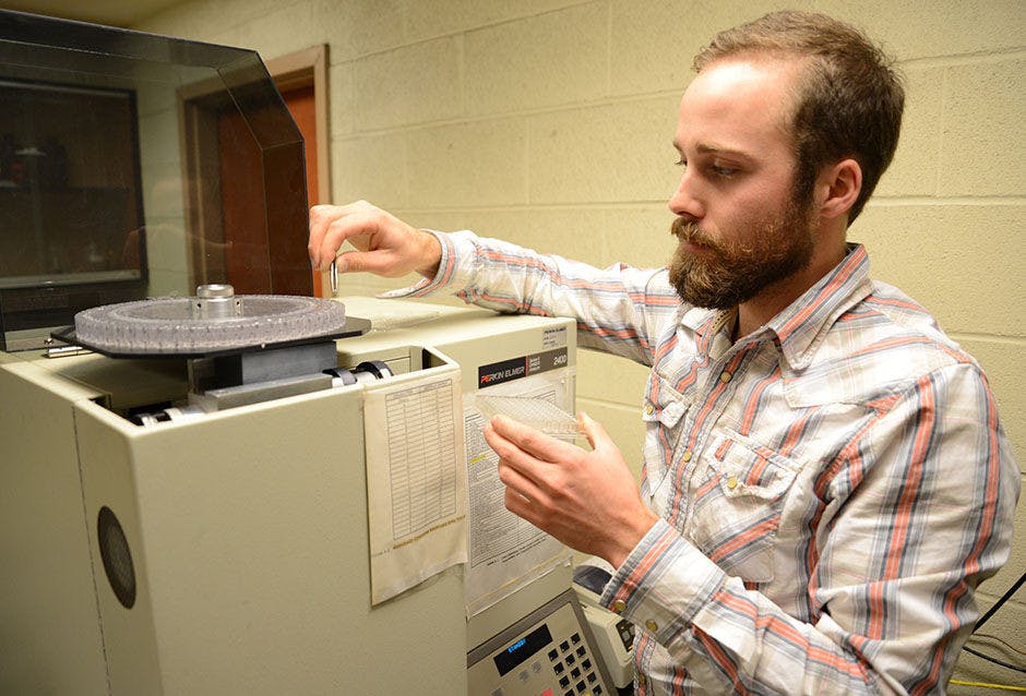 Graduate student Seth Wing is the lead investigator in a project which examines the carbon concentration in the Elwha river sediments. The CHN (carbon, hydrogen, nitrogen) analyzer combusts the soil samples to measure the amount of carbon, hydrogen, and nitrogen in each.