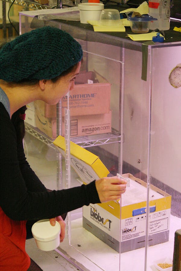 fbfc9952d32677d1fd4932a899824694.jpg Marie Clifford, a graduate student in biology and co-leader of the Urban Pollination Project, opens the enclosure bees are kept in to replenish the pollen supply.