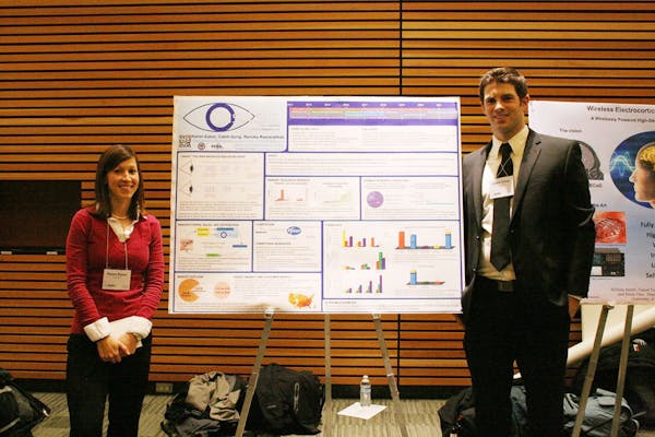 d3d626f96d9906d99c3f1e44a52ce64d.jpg UW students Karen Eaton, and Caleb Gerig show the poster describing InsuLenz, the product that won them first place in a competition put on by the Science and Engineering Business Association.