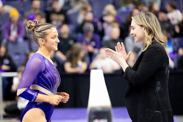 86dd557de11ced1036f74f47c0a7518e.jpg Junior Emily Innes convenes with head coach Jessa Hansen Parker prior to performing on the beam during Washington's meet against Michigan on Jan. 25, 2025 at Alaska Airlines Arena in Seattle, Wash.
