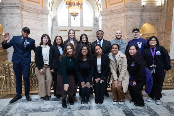 a664424b9c3cff5ce4a7a1f3c949efcd.jpg Students pose for a photo for the Huskies on the Hill event on Feb. 3, 2025 at the Washington State Capitol Building.