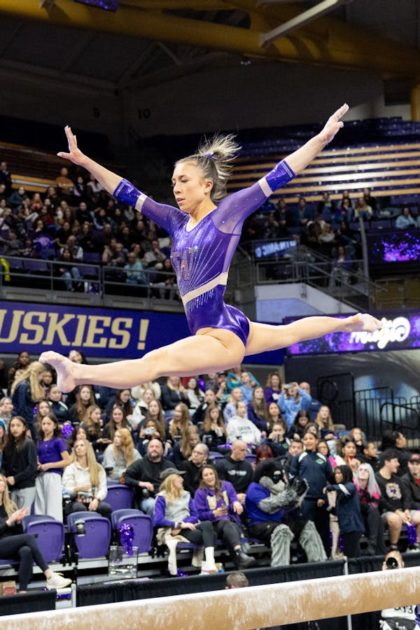 2caae988fdb88ef1df8b66fc995026b0.jpg Sophomore Chelsea Hallinan performs on the beam during Washington's meet against Michigan on Jan. 25, 2025 at Alaska Airlines Arena in Seattle, Wash.