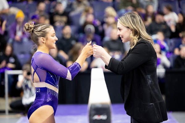 56788dde0471a556b90029be76c0f896.jpg Junior Emily Innes fist bumps head coach Jessa Hansen Parker prior to performing on the beam during Washington's meet against Michigan on Jan. 25, 2025 at Alaska Airlines Arena in Seattle, Wash.