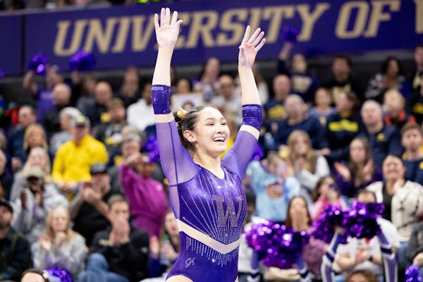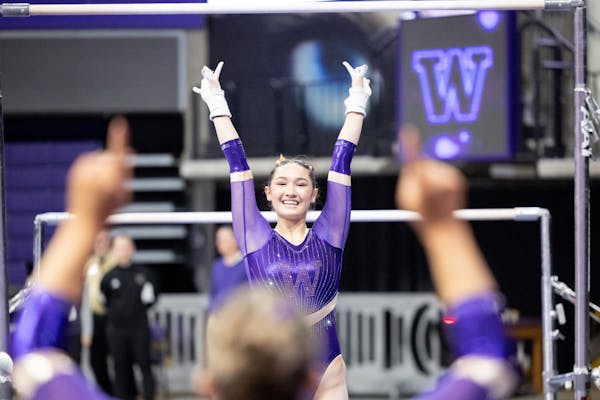 95988e9bde18f2f60a86cb736a2a30e3.jpg Graduate Taylor Russon poses after performing on the bars during Washington's meet against Michigan on Jan. 25, 2025 at Alaska Airlines Arena in Seattle, Wash.