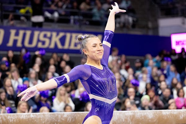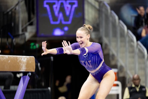 5e9998b12c3b39ca766b8db657729894.jpg Junior Olivia Oppegard celebrates after performing on the beam during Washington's meet against Michigan on Jan. 25, 2025 at Alaska Airlines Arena in Seattle, Wash.
